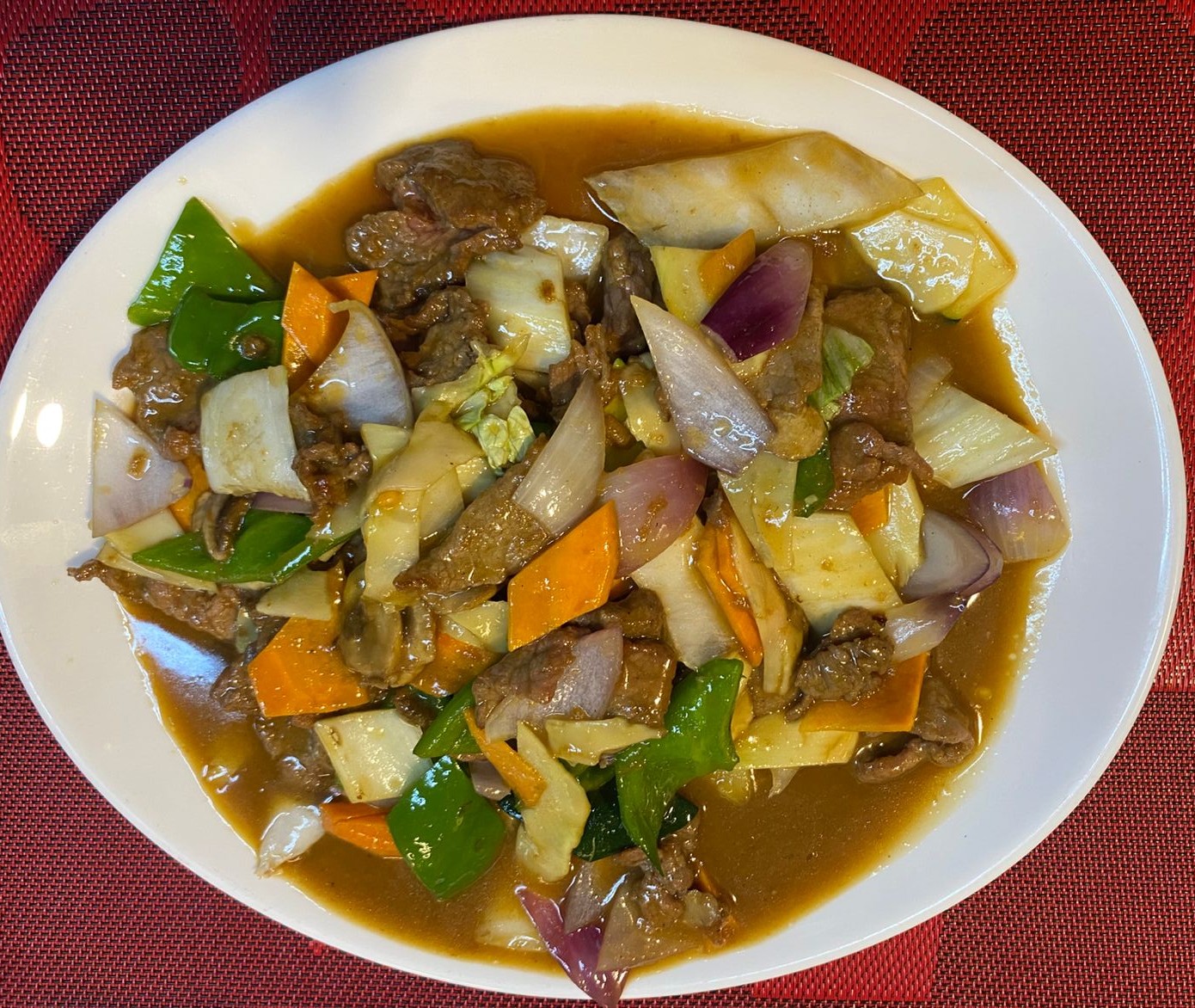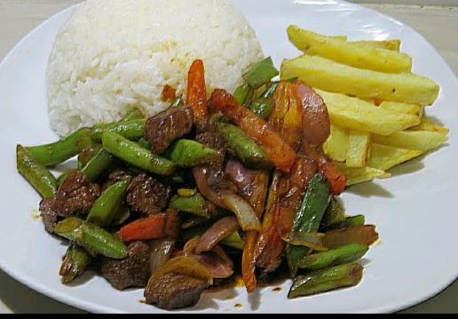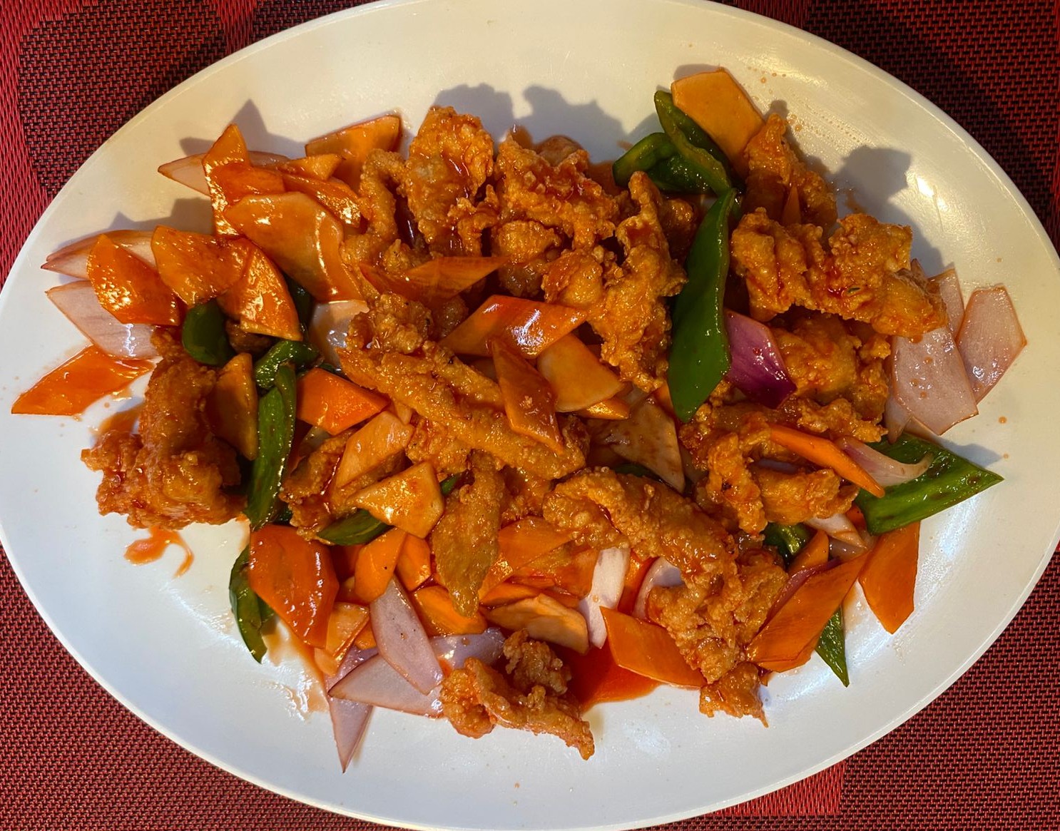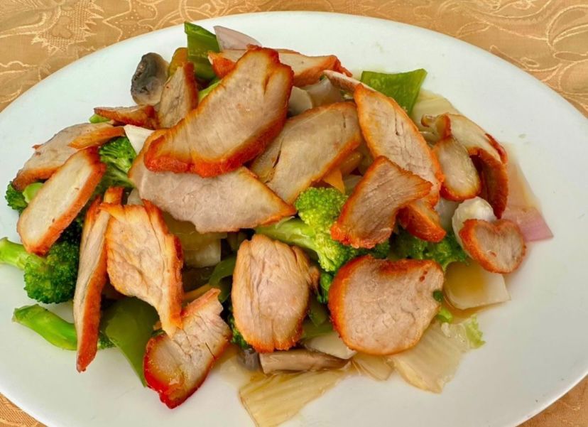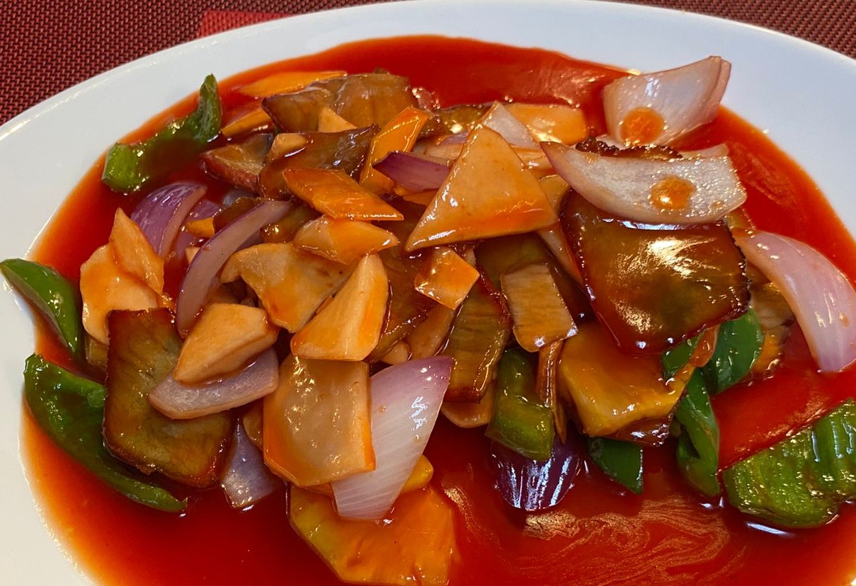 chancho salteado con agridulce verduras y porcion de