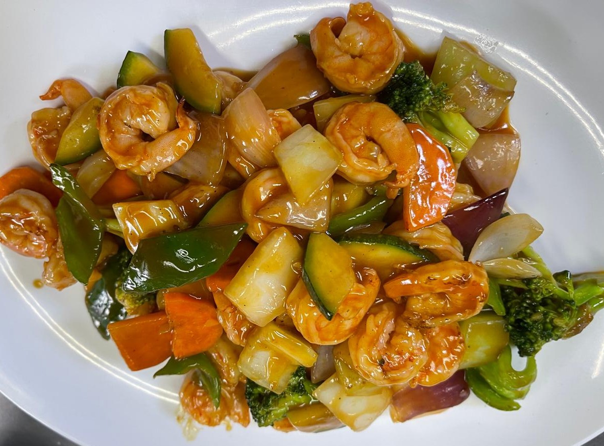 Camarones salteado con agridulce verduras y acompañado de