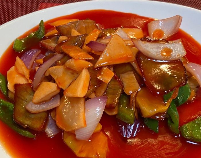 pollo salteado con agridulce y verduras y acompañado de arroz blanco